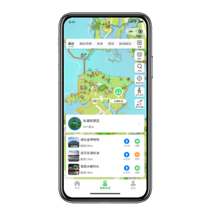 智能导览以地图的形式向游客展示景区景点、娱乐项目。根据游客人群推荐相关的景区二次消费产品,如景区烧烤、露营等,游客可在线预定,方便游客下单,增加景区收益。